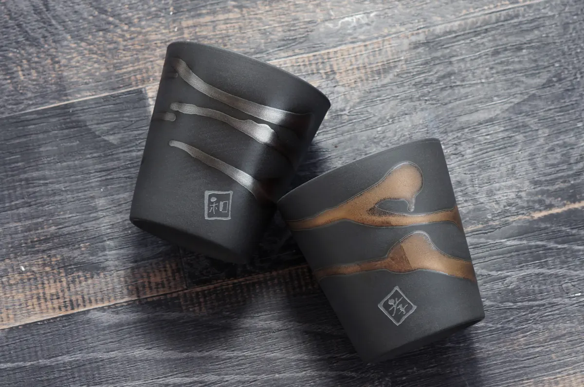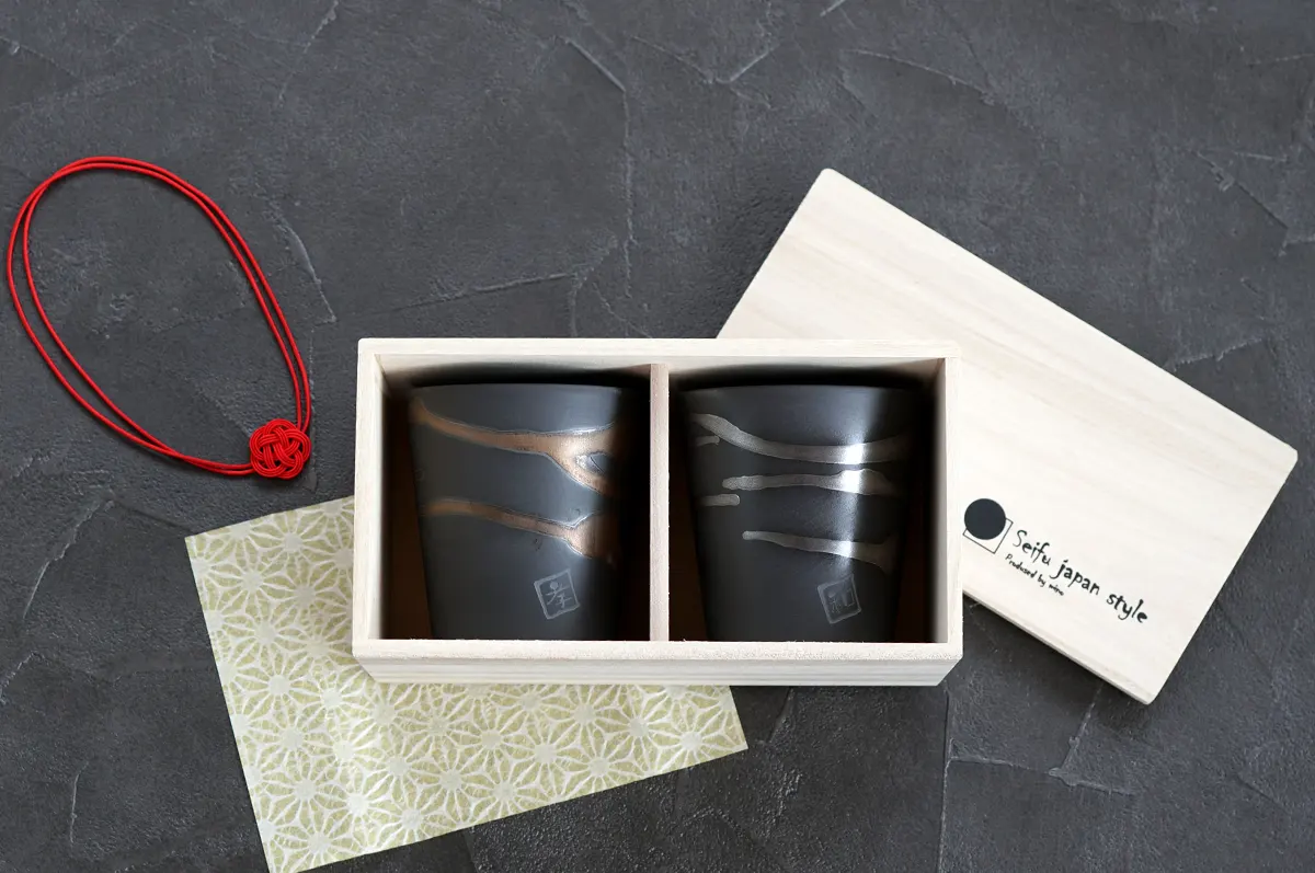 高級感漂う美濃焼の名入れ金銀流し雲ロックカップペア。銀婚式、金婚式、米寿や白寿など大切な節目のお祝いにぴったりなペアギフトです。