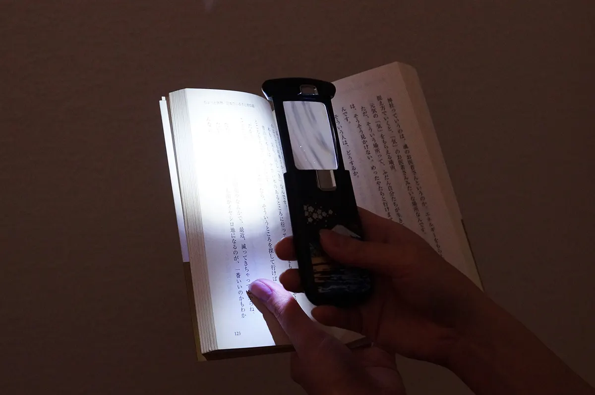 もちろんデザイン性だけではなく実用性も兼ね備えており、レンズが大きく読みやすい拡大倍率約3倍を採用。LED付きなので、小さい文字もラクラク見えますね。