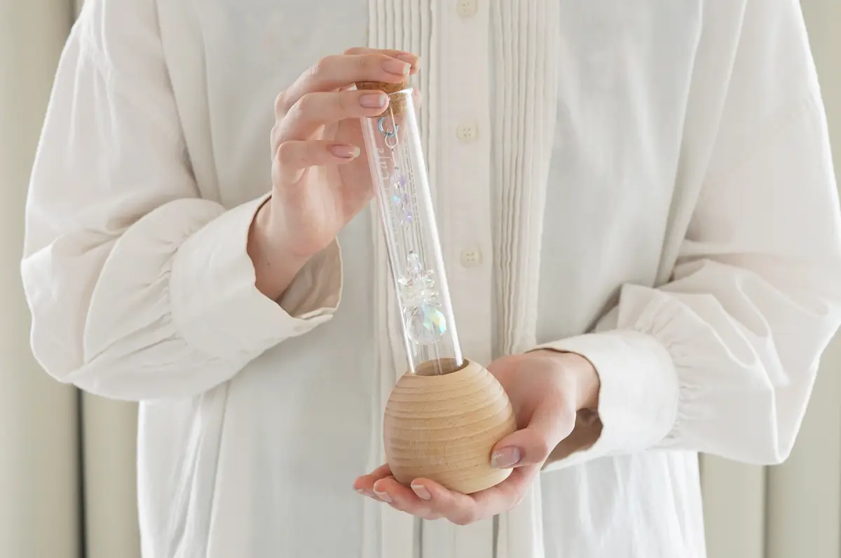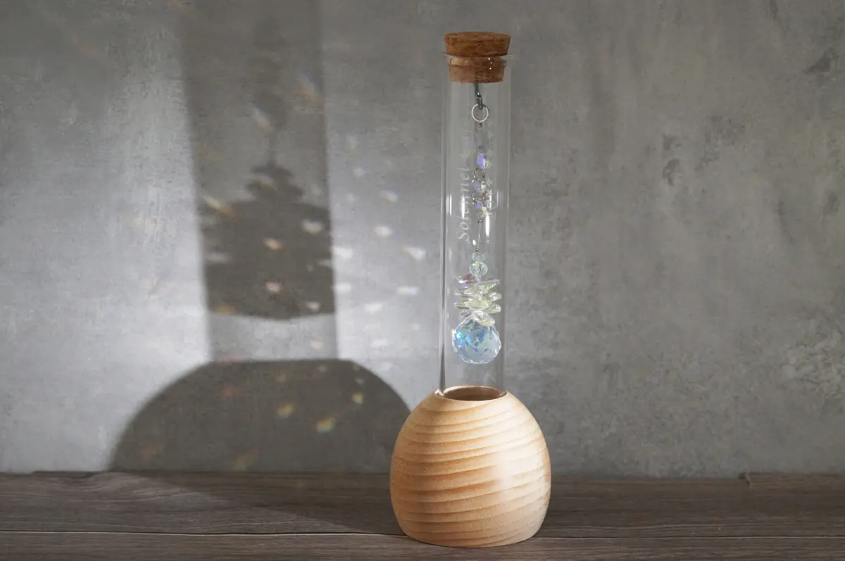 省スペースで置き場所を選ばない試験管型のサンキャッチャー。しっかりした木製の土台なので安定して置けます。虹色の輝きがお部屋をパッと明るい雰囲気に。お店の開店祝い・周年祝いにもおすすめです。
