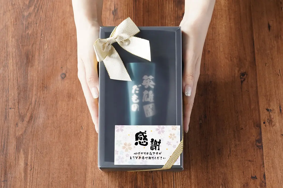 優美な桜柄がワンポイント。名前やメッセージを入れれば世界にひとつの贈り物に。女性の手でも持ちやすいスリムタイプです。