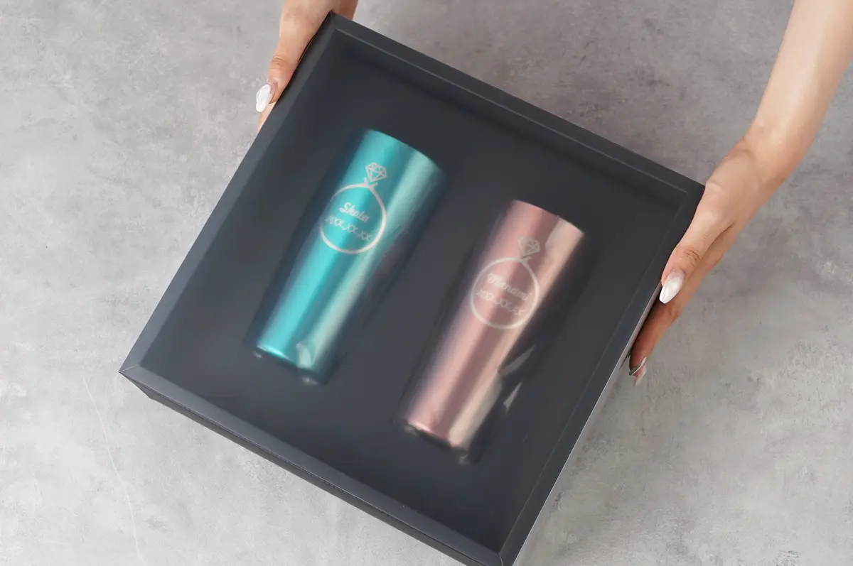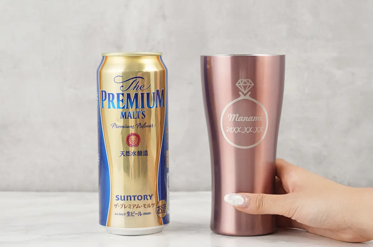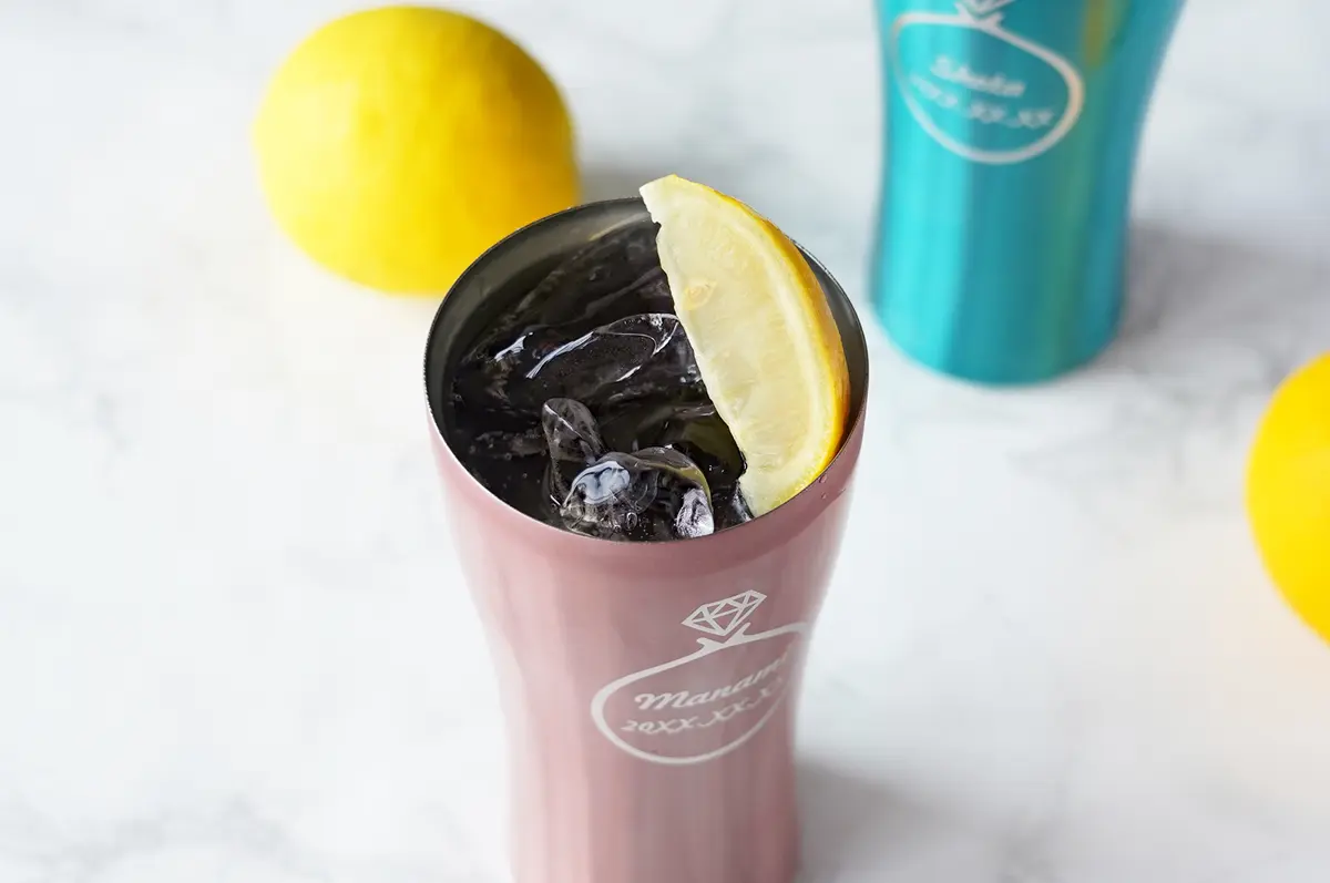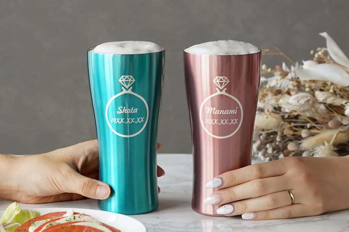 落としても“割れない”ステンレスのペアタンブラーは、結婚のお祝いにもぴったり。マリッジリングをイメージしたフレームの中にお名前や記念日を彫刻できます。