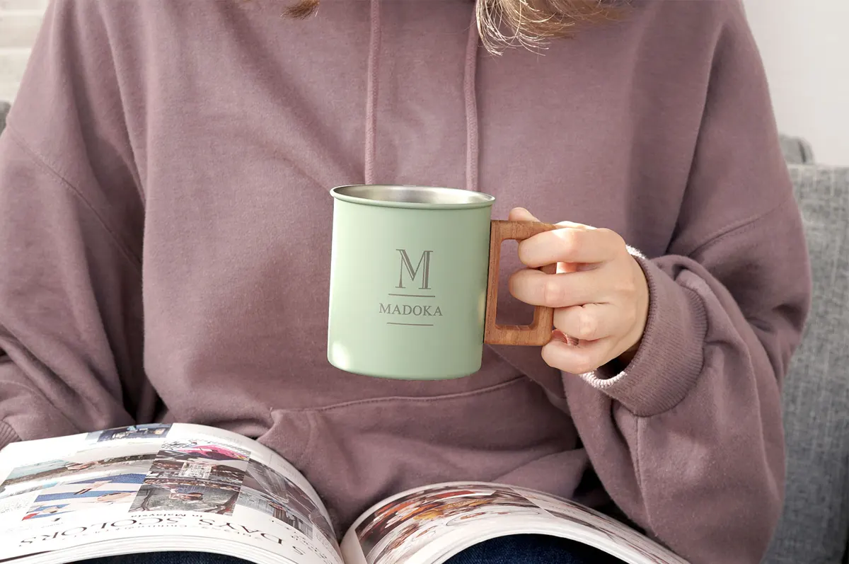 たっぷり400mlの大容量を注げるマグカップ。テレワークや勉強中に、何度も席を立って飲み物を入れなおす必要はありません。ステンレスの本体に、木製の取っ手が良いアクセントになり、自然の温かみを醸し出しています。
