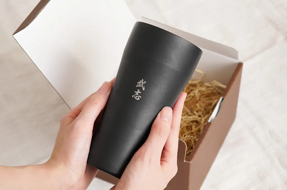 男性にも使いやすい、シンプルイズベストなタンブラー。「名入れは恥ずかしくて、外で使いづらい……」なんて方も、安心してください。控えめに刻まれた名入れは、主張しすぎずデザインに溶け込み、オシャレな一品へと仕上がっています。